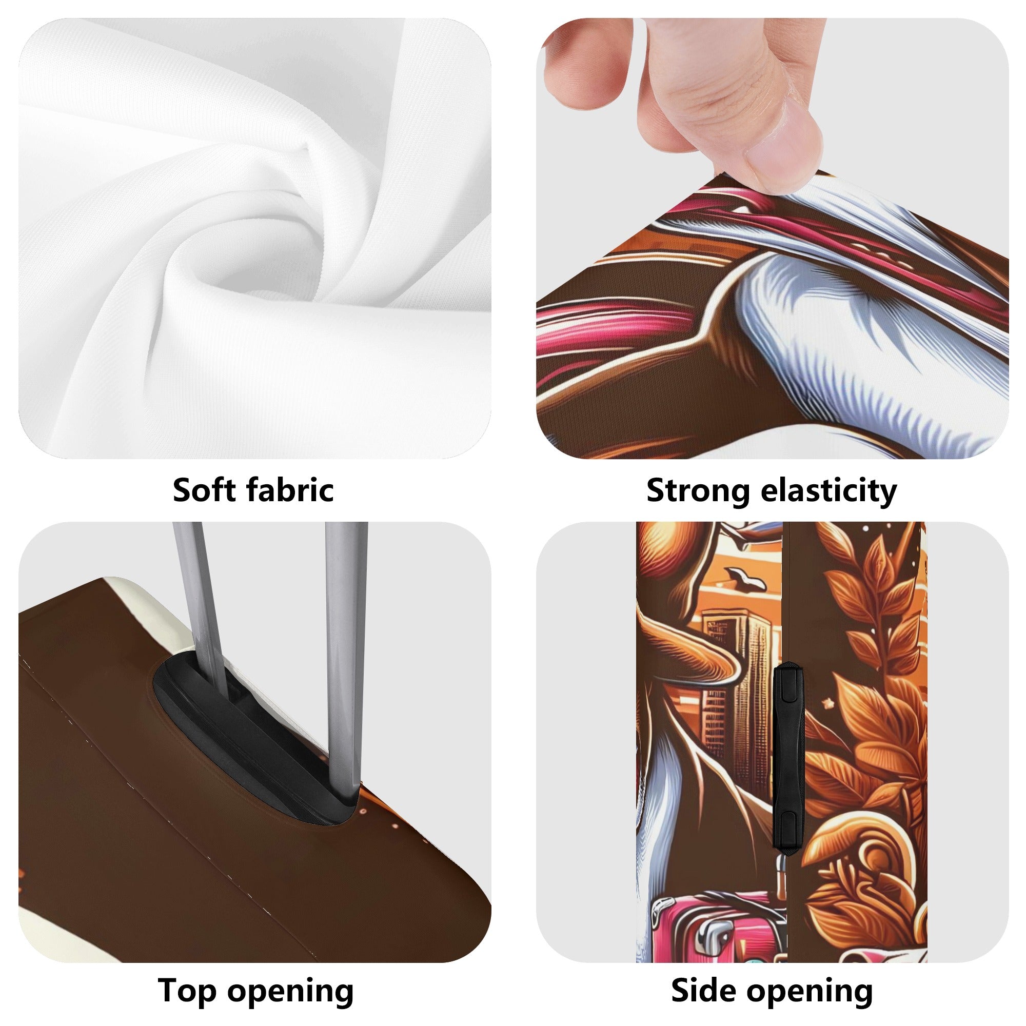 • The case cover comes in four sizes (S-XL) that correspond to different luggage box models. It has a unique opening on top for the telescopic handle and carry handle, and zippers on both sides for the side handles. This makes it easy to load and unload your luggage without removing the case cover.