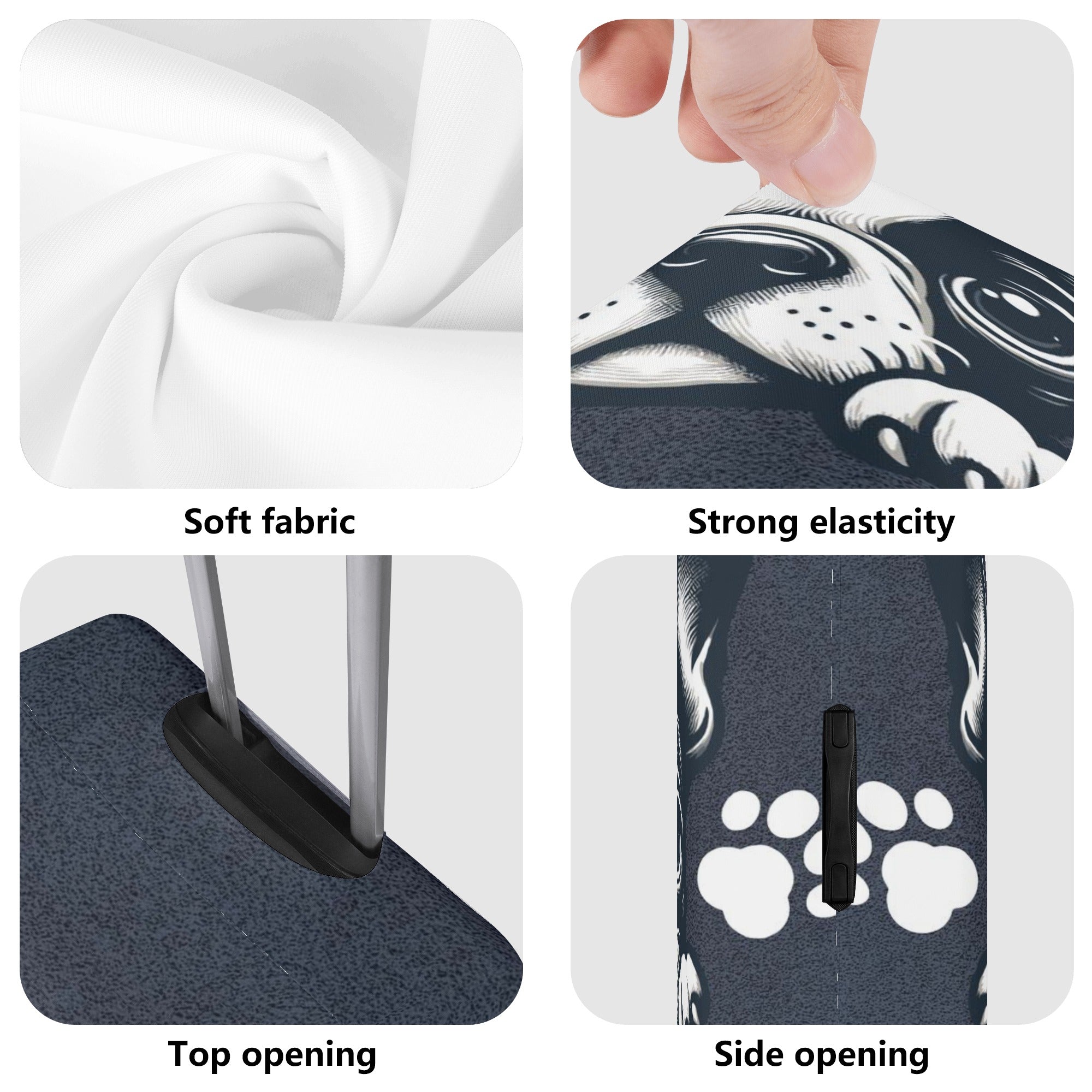• The case cover comes in four sizes (S-XL) that correspond to different luggage box models. It has a unique opening on top for the telescopic handle and carry handle, and zippers on both sides for the side handles. This makes it easy to load and unload your luggage without removing the case cover.